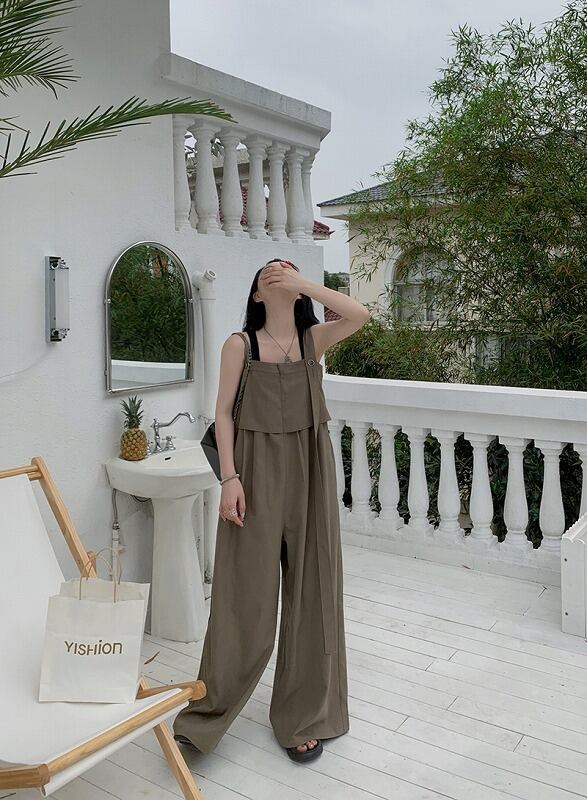 オールインワン オーバーオール ノースリーブ 切り替え 体型カバー 着痩せ シンプル サロペット パンツ ズボン 袖なし